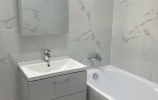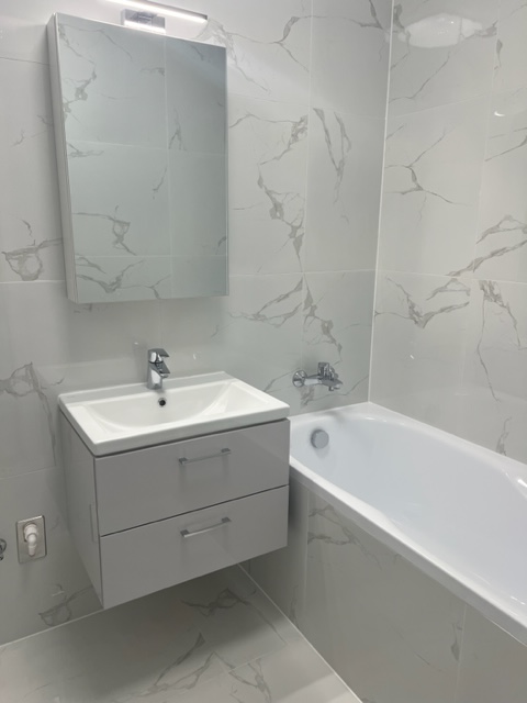 – v kúpeľni nová dlažba, moderné obklady, vaňa a batéria so sprchovacím setom značky GROHE,