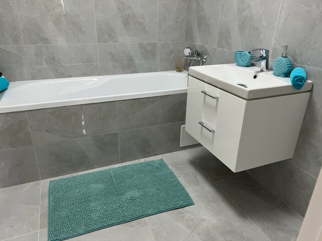 – veľkoformátová dlažba a obklad v kúpeľni a na WC